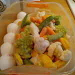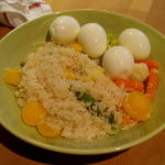 Meine Idee war nun, in einer Schale den Reis und das Gemüse zusammen zu garen und mit dem Tauwasser des TK-Gemüses den Reis oder die Nudeln zu garen.